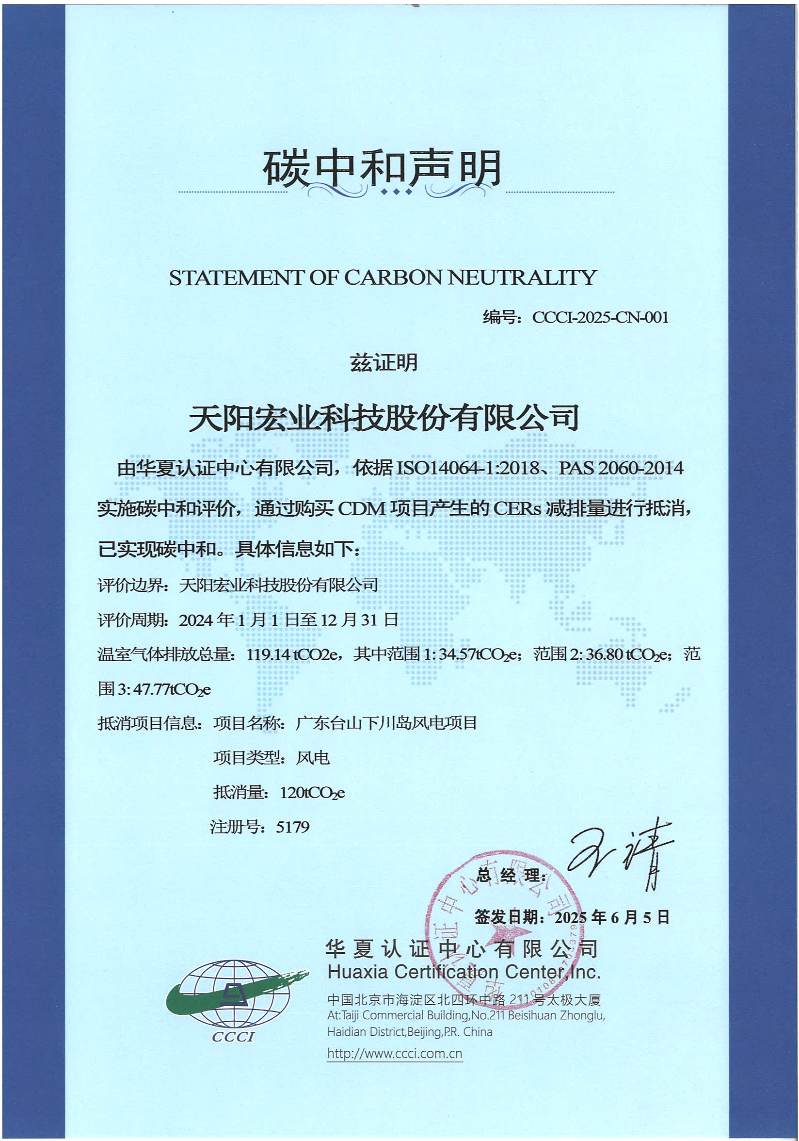 | 天阳宏业科技股份有限公司 | 2024-01-01 至 2024-12-31 | 119.14(范围1、2、3) | 120 | 购买CDM:广东台山下川岛风电项目,注册号5179 |