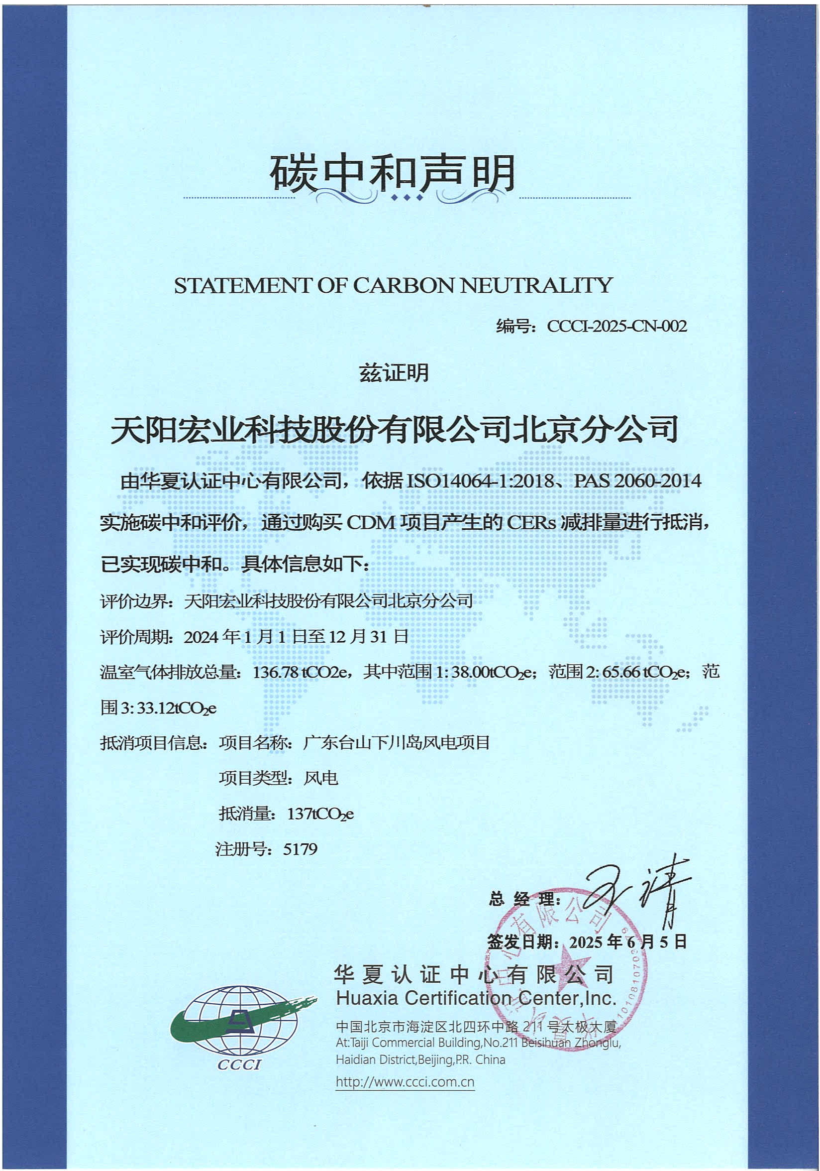| 天阳宏业科技股份有限公司北京分公司 | 2024-01-01 至 2024-12-31 | 136.78(范围1、2、3) | 137 | 购买CDM:广东台山下川岛风电项目,注册号5179 |